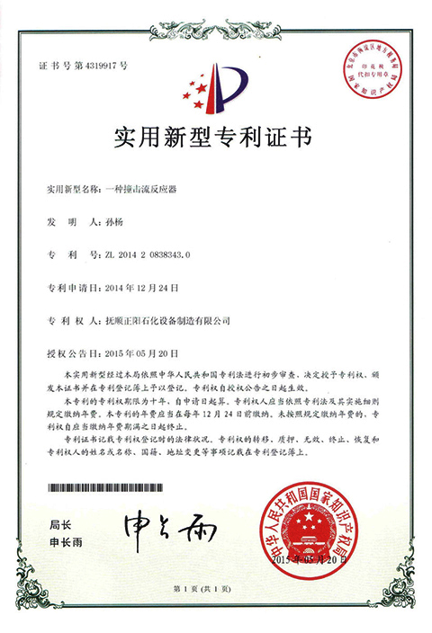 一種撞擊流反應器專利證書